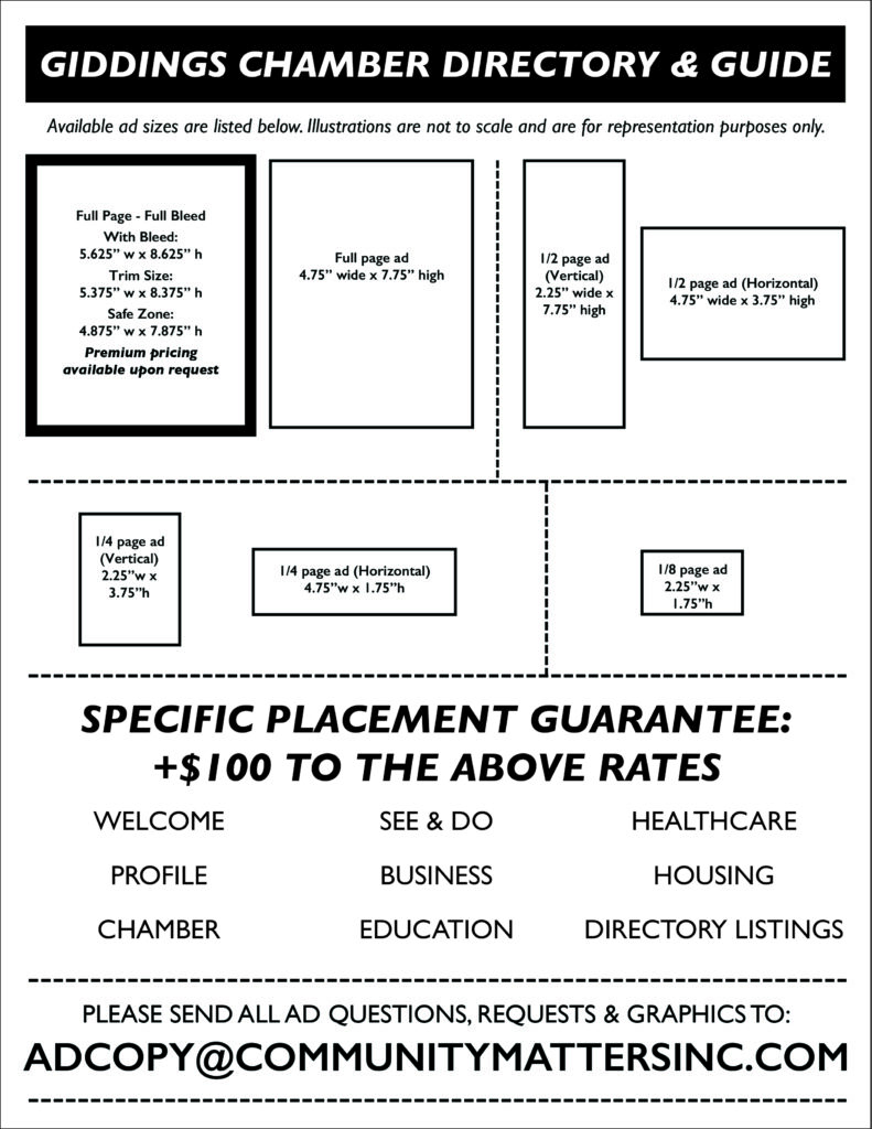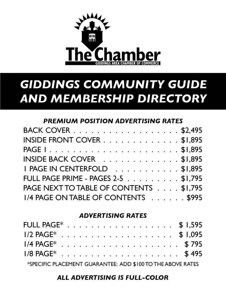 The Giddings Area Chamber Community Guide & Membership Directory is a crucial publication that helps to tell the story of Giddings as it connects the local business community to the public.