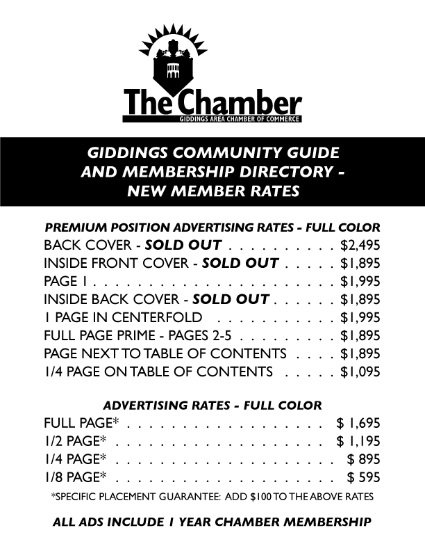 You can click the image below to see a sample of the previous edition of the Giddings Area Chamber Community Guide & Membership Directory.