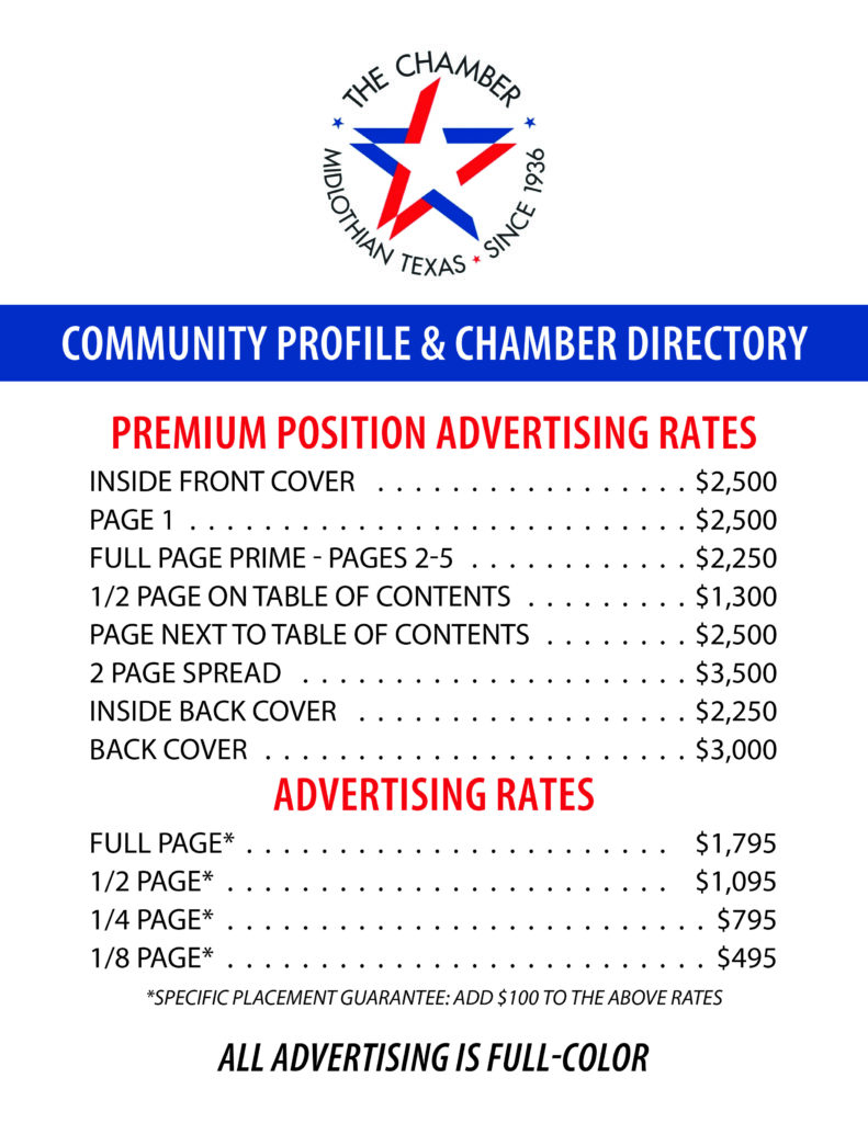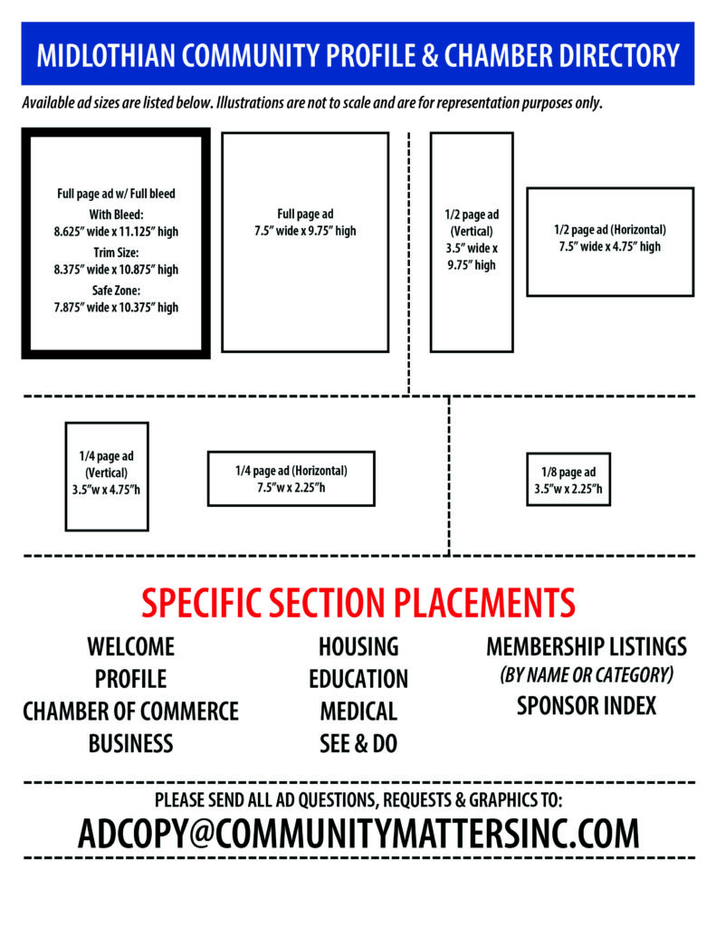 The Midlothian Community Profile & Member Directory is an annual publication of the Midlothian Chamber of Commerce. The Chamber will this publication to promote the Midlothian area in all of the areas that the Chamber is involved with including: