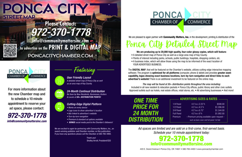 Right now, we are just reserving ad space. We still have a few weeks to collect the artwork, and if needed, we can work out payment terms. If you are interested in participating in the new Ponca City Chamber Map, then please email info@communitymattersinc.com or call 972-370-1778.