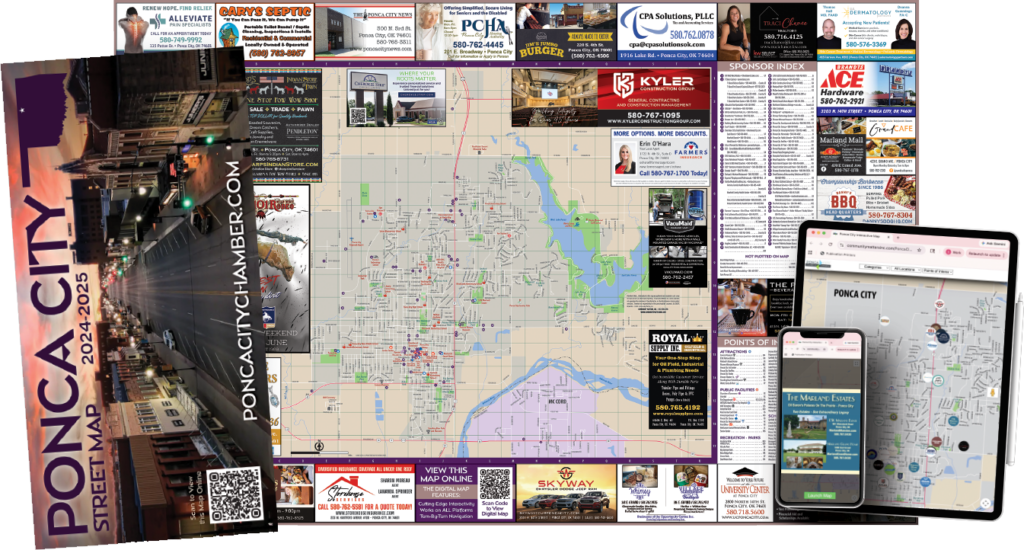 The Chamber Map is a crucial publication that helps to tell the story of Ponca City and to showcase some of the Ponca City Chamber member businesses. The map is also a non-dues revenue generator for the Chamber, which is important when it comes to advancing the Chamber’s mission without always having to raise membership fees. We typically see about a 70% renewal rate from advertisers from the previous issue to choose to participate again the next year.